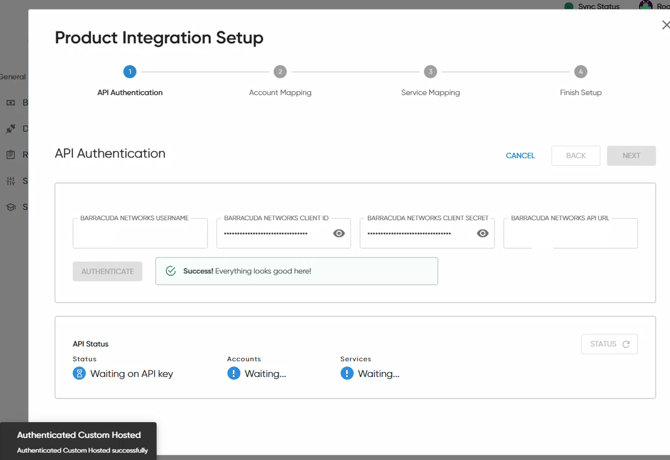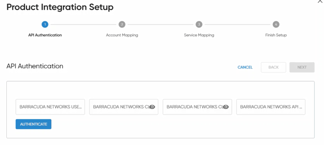 - Return to the Barracuda Product Integration page, enter your Barracuda API key, and press Authenticate.