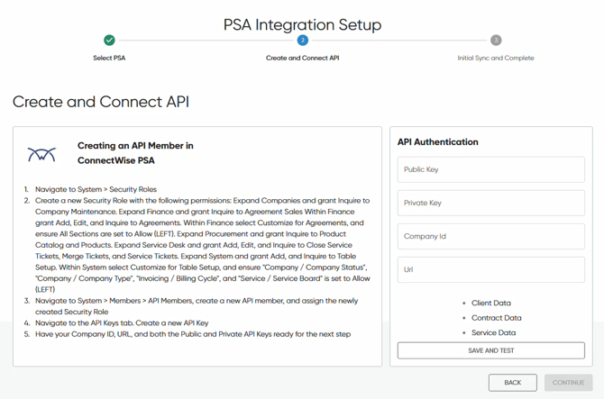- Once you have chosen your PSA from the previous step, a set of API connection requirements will be displayed on the screen for you to follow.