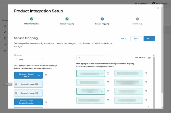 - Similar to account mapping, you will see a list of Barracuda services on the right side of your screen. You can map the corresponding service (s) from your PSA to the correct service with Barracuda.
